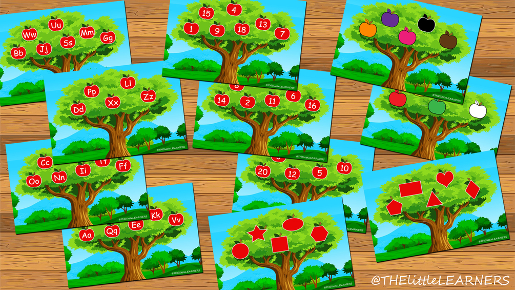 1. In this combo offer of apple tree activity sheet you will get English alphabets from A to Z , 1 to 10 Numbers matching, Shapes (circle, square, triangle & more) and Colors (red, yellow, green & more).