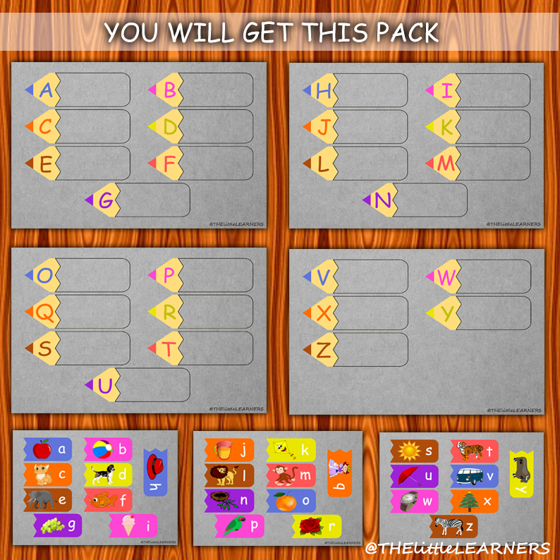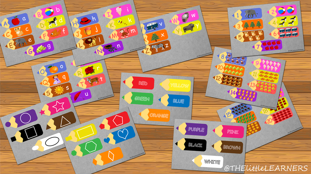 1. In this combo offer of pencils activity sheet you will get English alphabets from A to Z , 1 to 10 Numbers matching, Shapes (circle, square, triangle & more) and Colors (red, yellow, green & more).